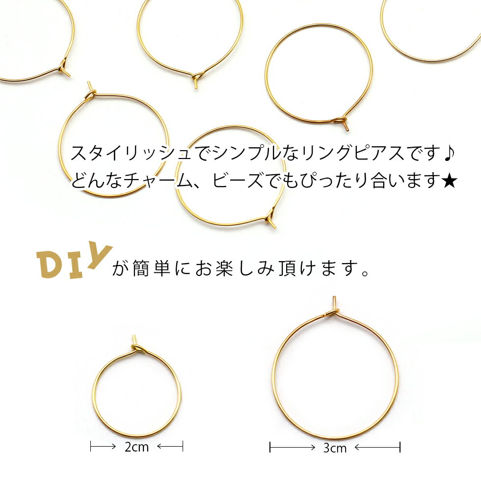 ITEM DETAIL 商品名 ワイヤフープピアス カラー ゴールド 数量 10個入り 種類・サイズ1.直径20mm 2.直径30mm ※大きさは個々によって多少の誤差がございます。
